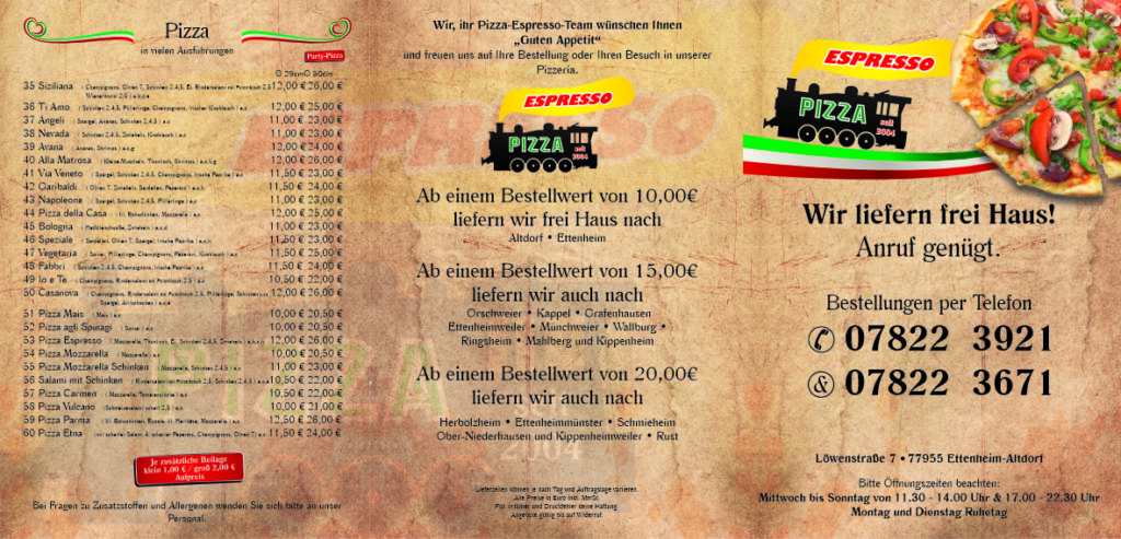 - ab einem Mindestbestellwert von 15 € nach Orschweier, Kappel, Grafenhausen, Ettenheimweiler, Münchweier, Wallburg, Ringsheim, Mahlberg und Kippenheim.